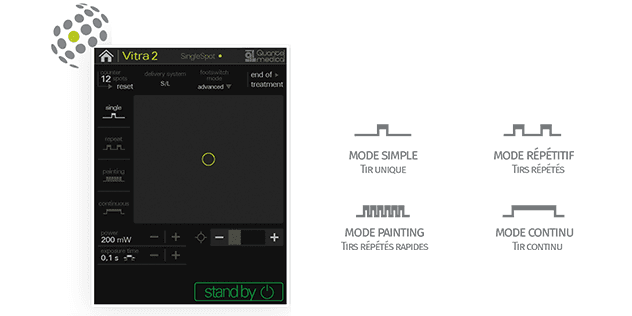 SingleSpot Mode: Conventional thermal retina treatments using long pulse durations (100-200ms) with 4 customizable shooting modes: